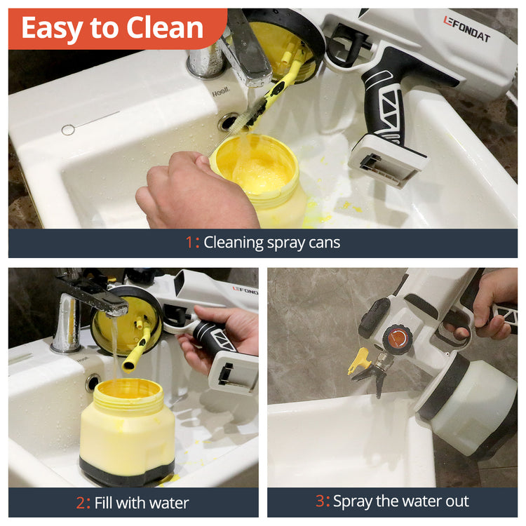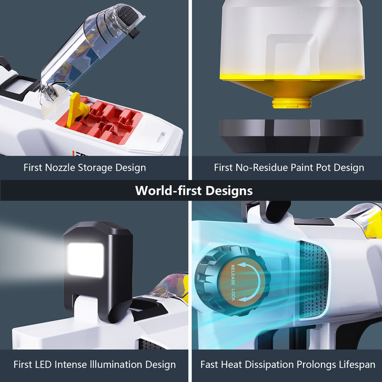 Our spray gun features a breakthrough cone-shaped pot bottom design, effectively minimizing paint residue regardless of the spraying angle. The unique nozzle storage compartment allows convenient access and secure storage of nozzles