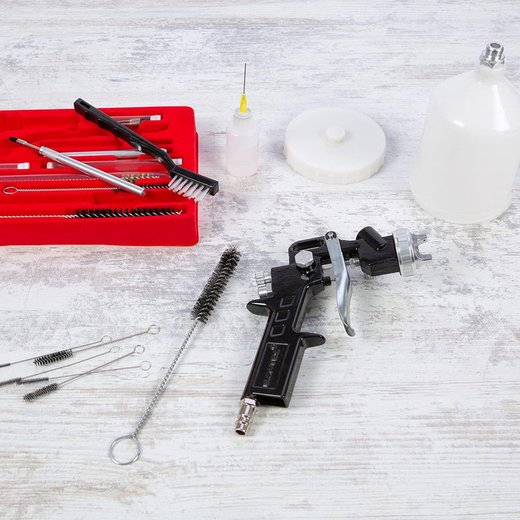 - The spray gun cleaning kit includes all the brushes and components needed to clean every part of the gun. The precision needle set and handle will effectively clean seals, circlips, and more.